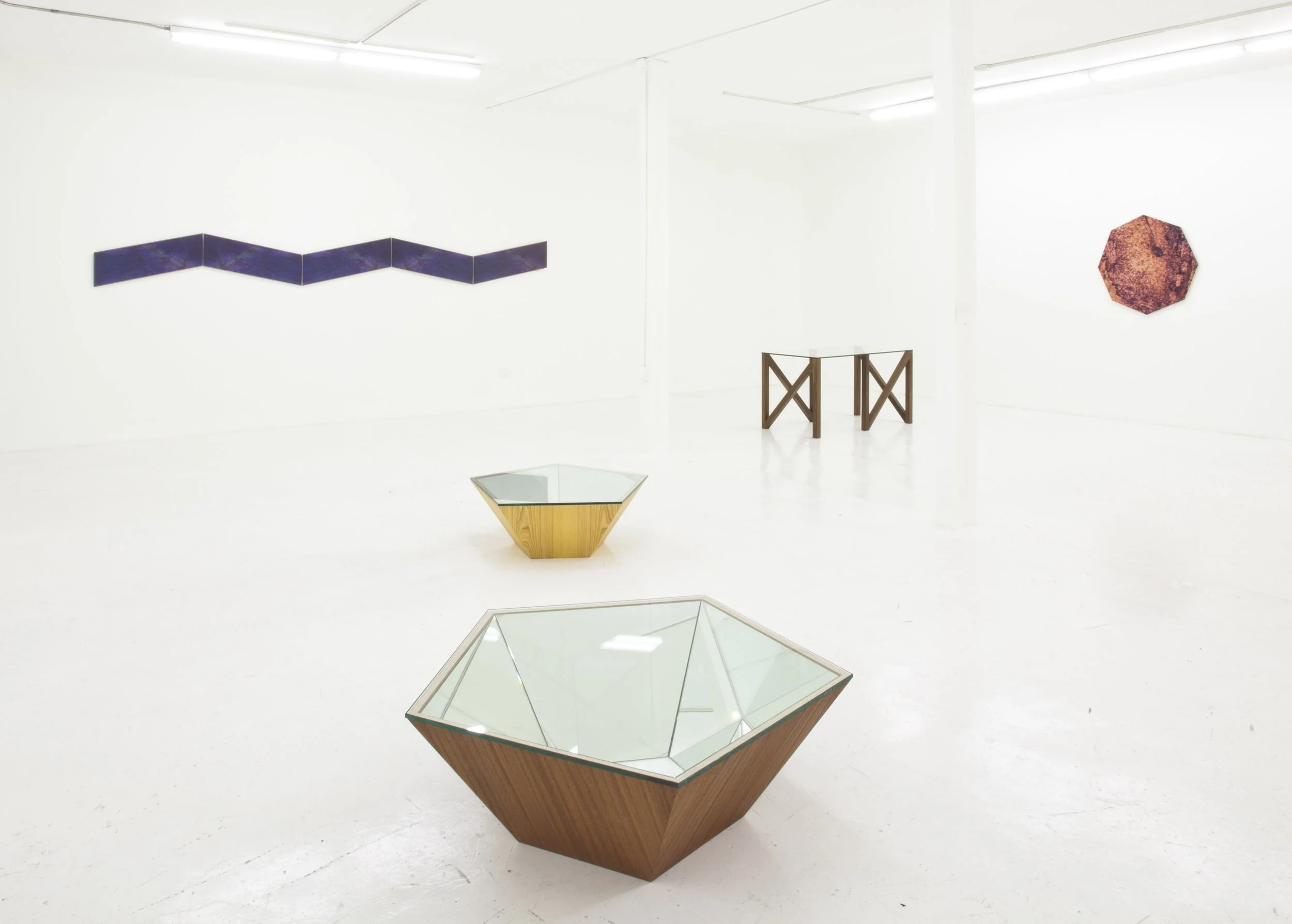 Transcribing this to the physical construction process presents a set of challenges and absurdities. With “Sliced Parallelepiped Lights” (2012) and “Rainbow Bookmatches” (2012), the discrepancy between the rendering and the real objecthood is cleverly self-evident. The boxes surrounding the lights are constructed as though they were 2-dimensional drawings made to look like 3-dimensional objects. From one angle they appear square, but up close they are actually impeccably constructed parallelogram boxes. “Rainbow Bookmatches” (2012) applies a different aspect of illusion. Bookmatching is a technique where a material such as wood veneer or marble is mirrored to create a facing pattern—like a Rorschach test. Here, the bookmatching occurred in the rendering first, and then the overall shape of the wall tiles was skewed. It is not real marble slabs but a digital image of mirrored marble pattern printed directly onto the wood; otherwise, the shapes and relative patterns would not match. Moore’s obvious use of an artificial façade provides the sophisticated framework of Surface Tension. A reverse trompe l’oeil is imposed on objects in the form of mica, print, or veneer as an indicator that taps into a long cultural history of building, design, and status.
